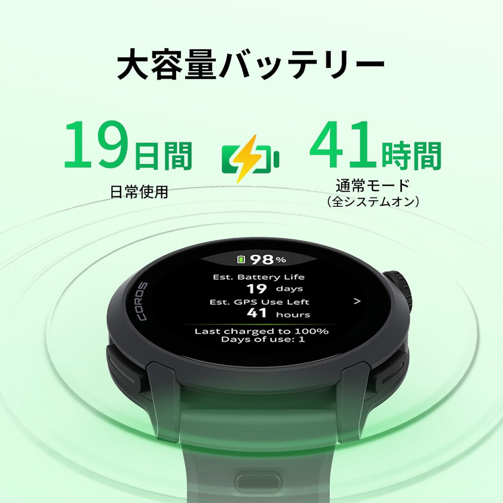 連続使用時間 ■全システムオン(GPS、GLONASS、Galileo、Beidou、QZSS):41時間、14時間(オフライン音楽)、■二周波オン(GPS、GLONASS、Galileo、Beidou、QZSS):31時間、12時間(オフライン音楽)、■日常使用:19日間、(ストレス計測含む)