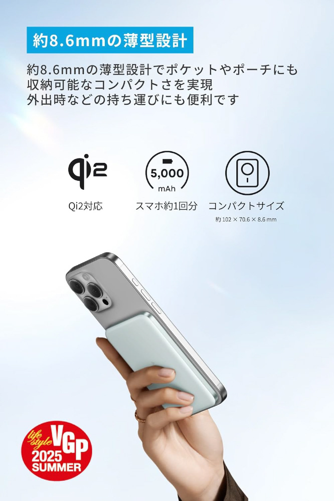 サイズ:約102×71×8.6mm、重さ:約110g、容量:5000mAh、入力:USB-C入力:5V=3A / 9V=2.22A、出力、USB-C出力:5V=3A / 9V=2.22A (Max 20W)、ワイヤレス出力:Max 15W、合計Max出力:17W (USB-C:Max 12W / ワイヤレス出力:Max 5W)
