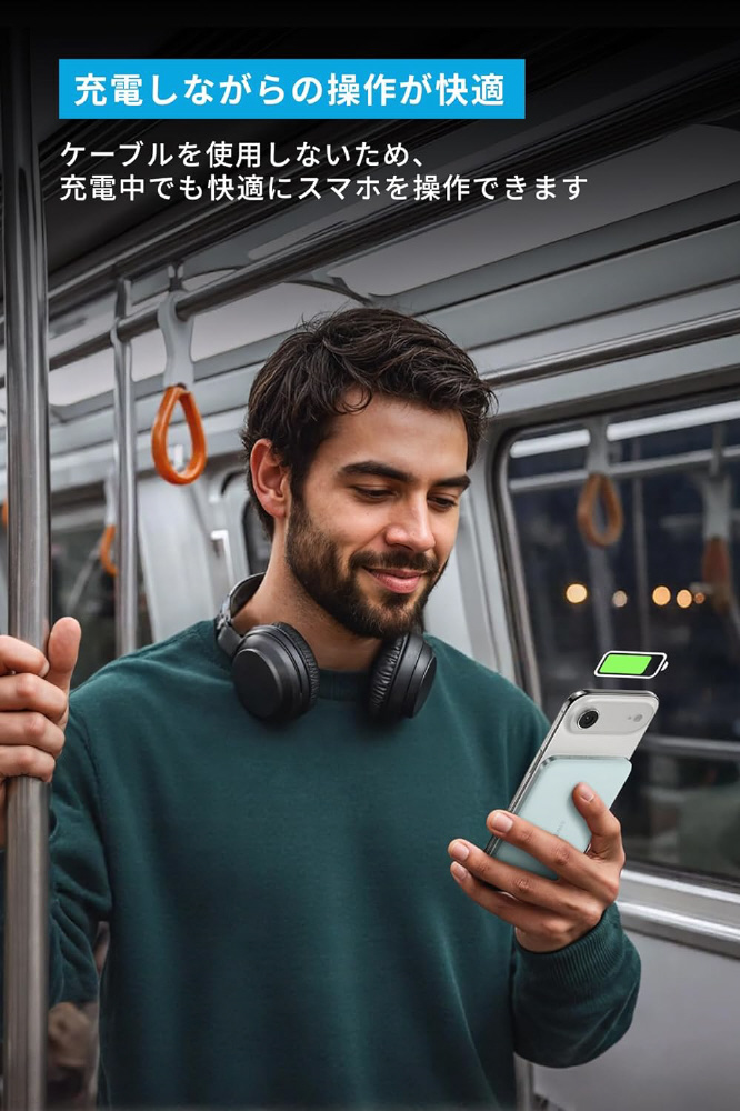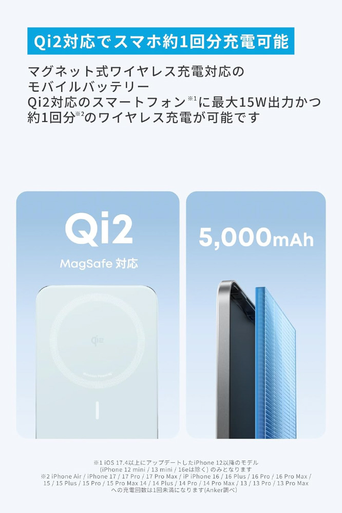 マグネット式ワイヤレス充電対応のモバイルバッテリーで、Qi2対応のスマホに最大15W出力かつ約1回分のワイヤレス充電が可能です。