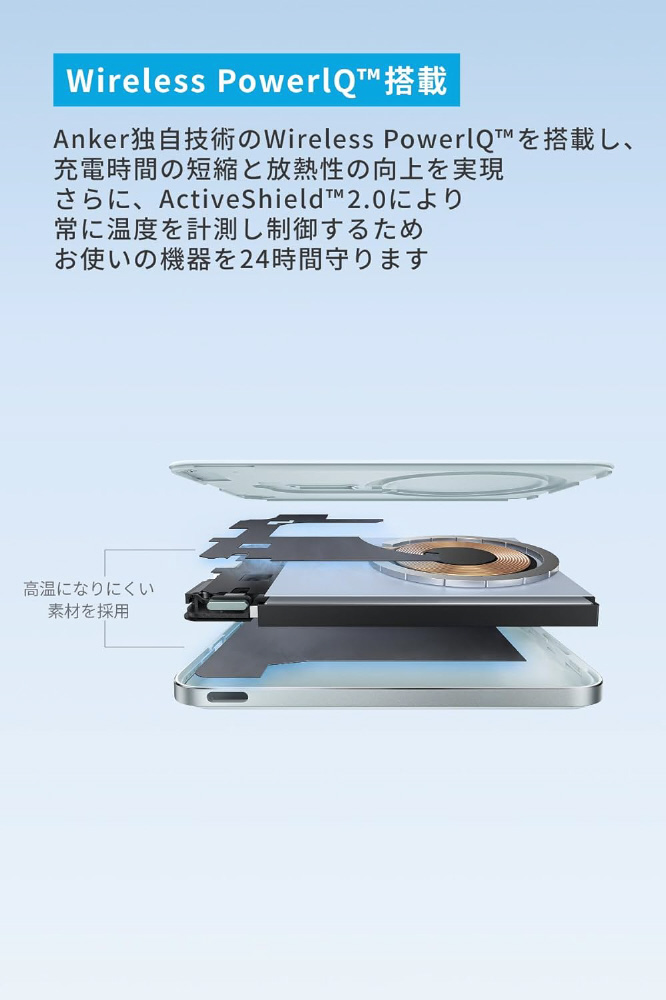 Anker独自技術のWireless PowerlQを搭載し、充電時間の短縮と放熱性の向上を実現。さらに、ActiveShield 2.0により、常に温度を計測し制御するため、お使いの機器を24時間守ります。