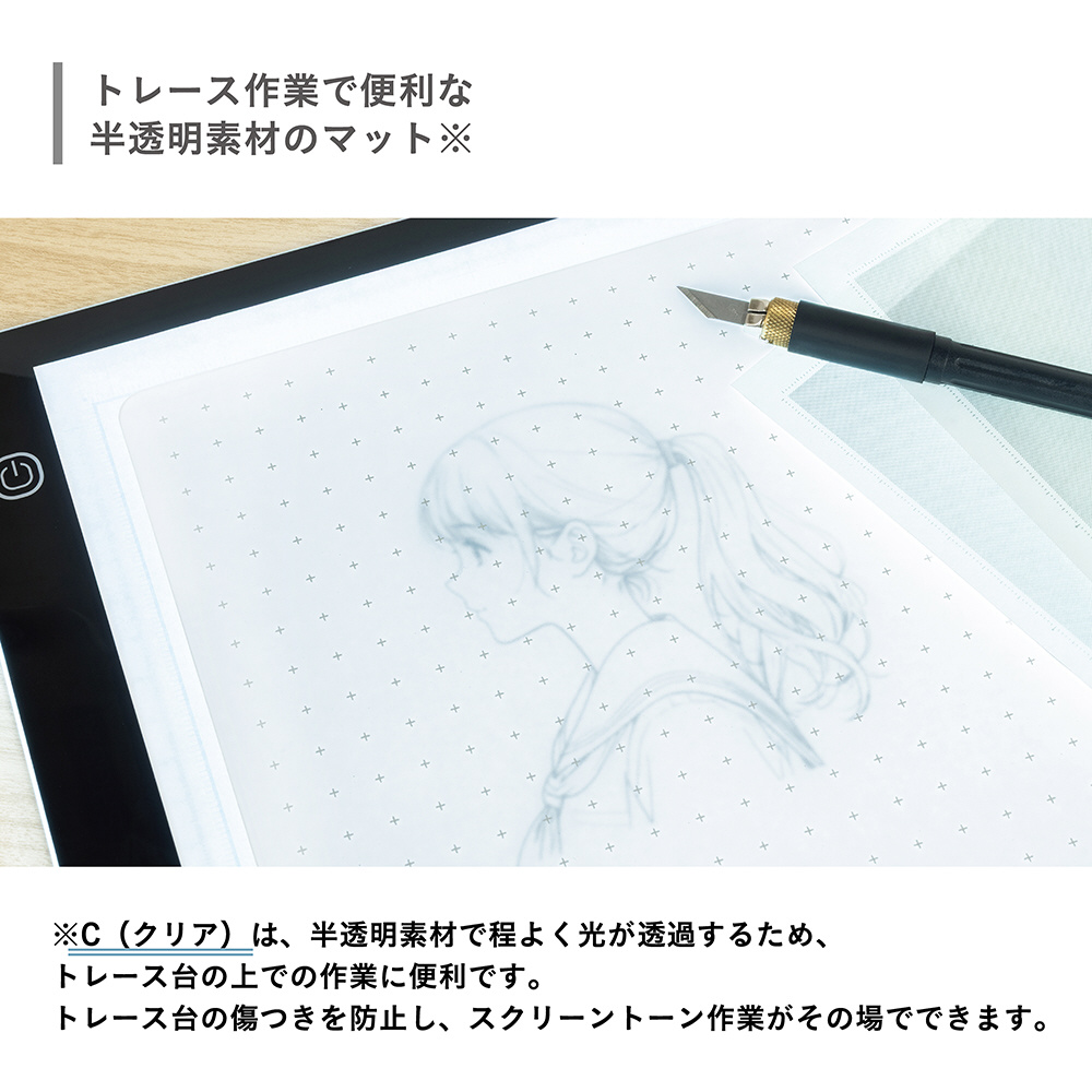 ●C(クリア)は半透明素材で程よく光が透過するため、トレース台の上での作業に便利