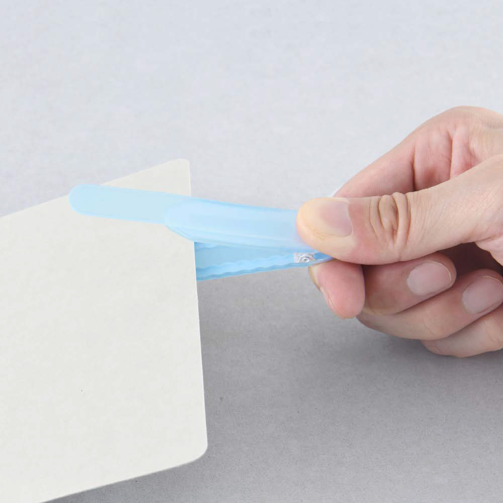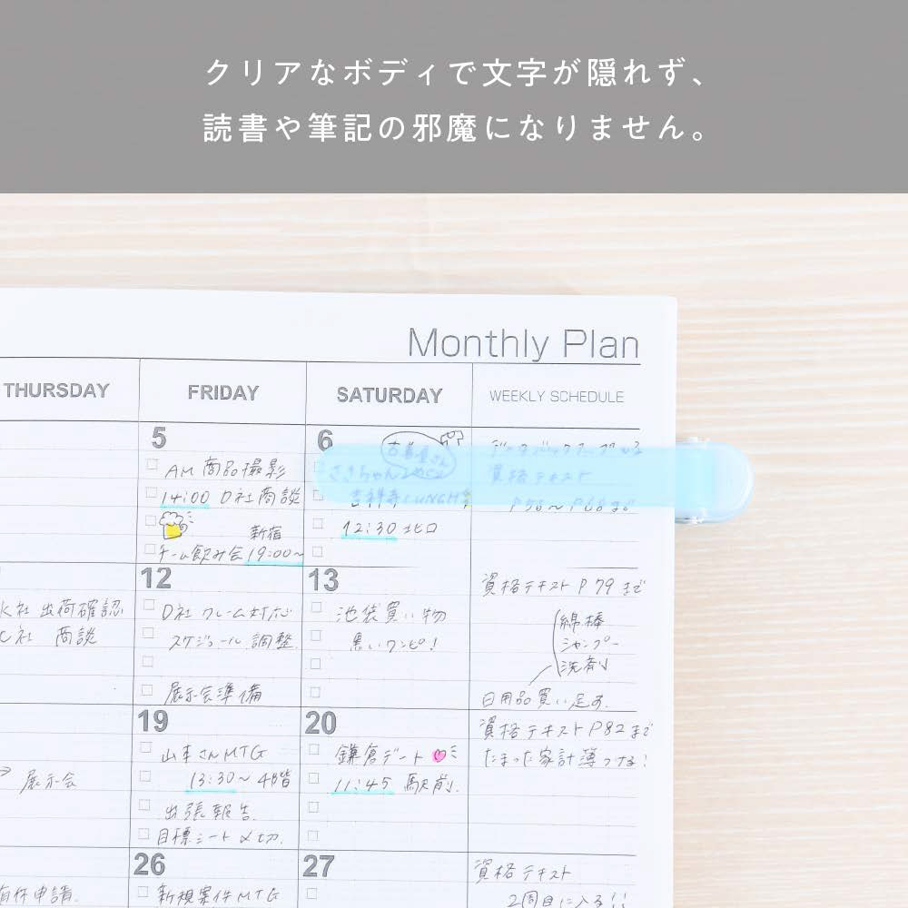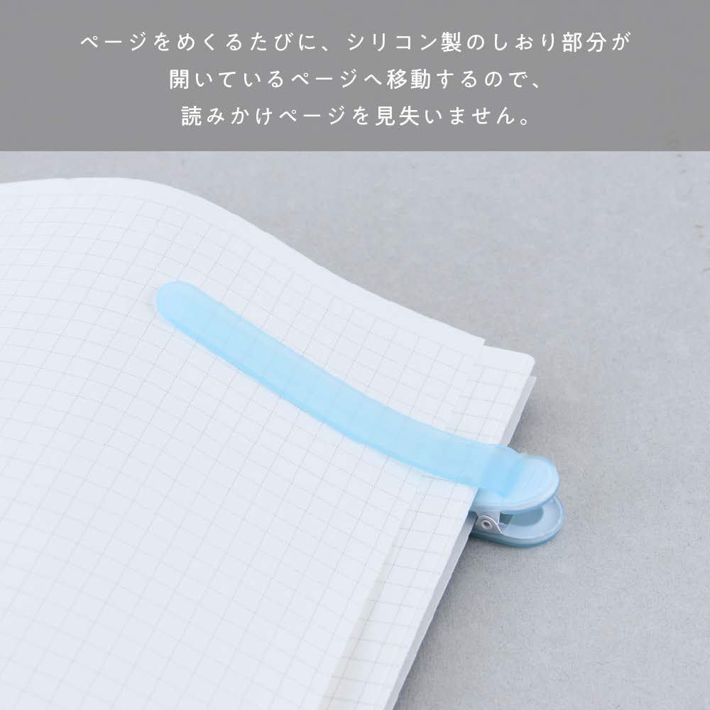 ページをめくっても、しおり部分が自動で追従して開いたページをしっかりキープするので、読みかけのページを見失いません。クリアなボディで文字が隠れず、読書や筆記の邪魔になりません。クリップ型で、表紙に挟んで仕様するので、なくす心配もありません。