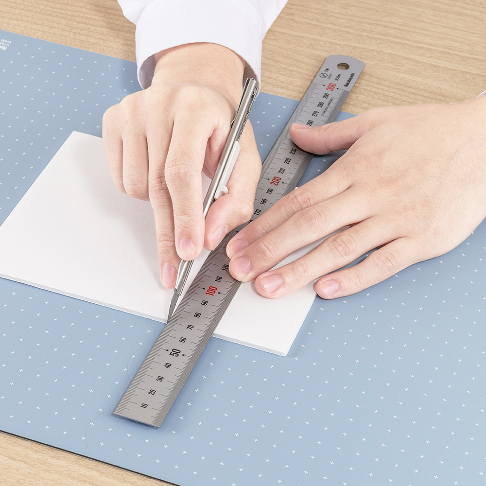 「折りたたみカッティングマット+シリーズ」は、本体を半分に折りたためる二つ折り仕様のカッティングマットです。折りたためることで、使わないときは収納しやすく、作業スペースが確保できないときは省スペースでコンパクトに使うことができます。