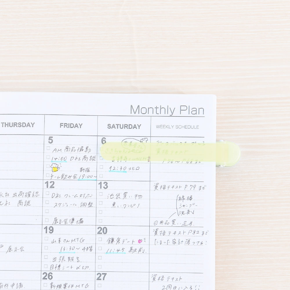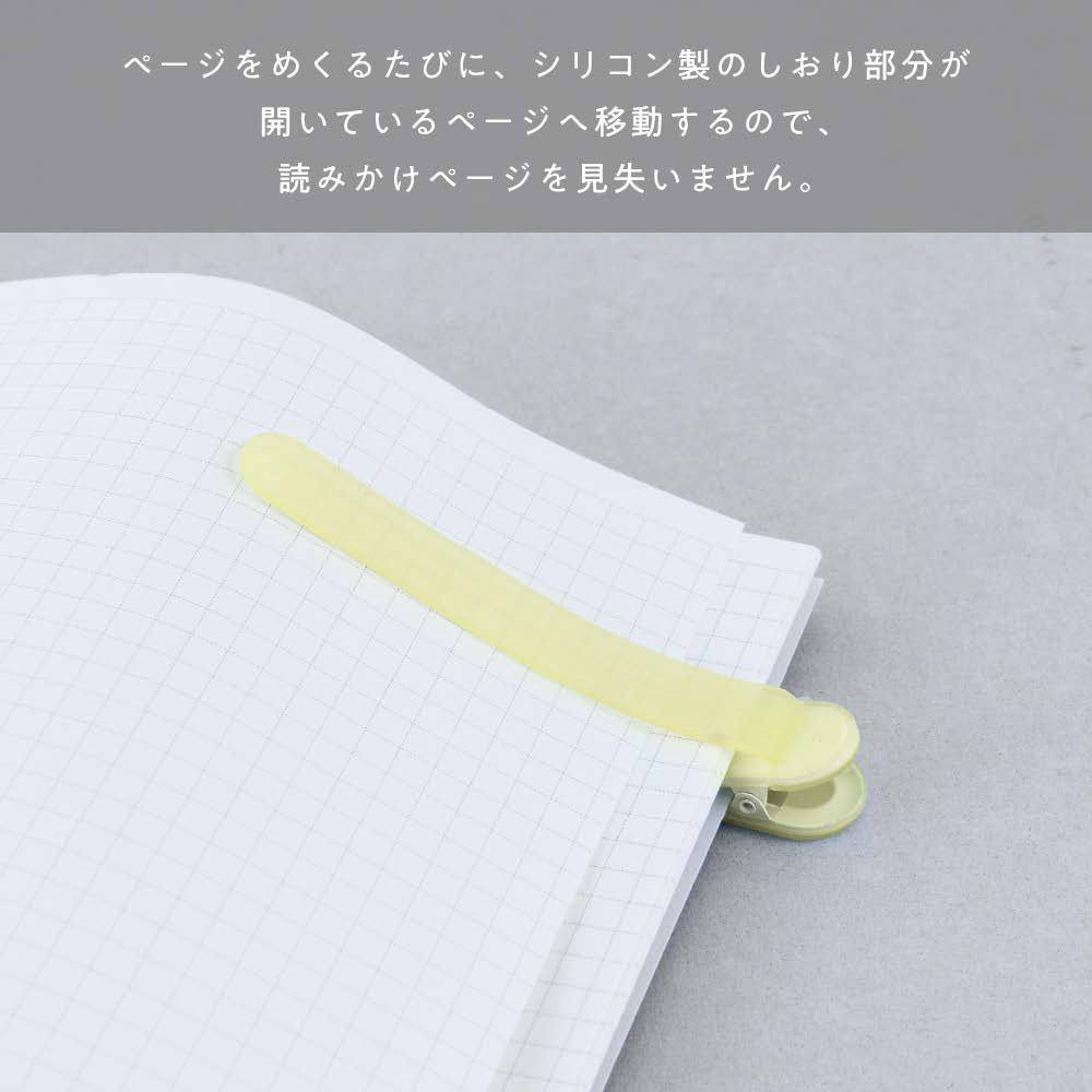 ページをめくっても、しおり部分が自動で追従して開いたページをしっかりキープするので、読みかけのページを見失いません。クリアなボディで文字が隠れず、読書や筆記の邪魔になりません。クリップ型で、表紙に挟んで仕様するので、なくす心配もありません。