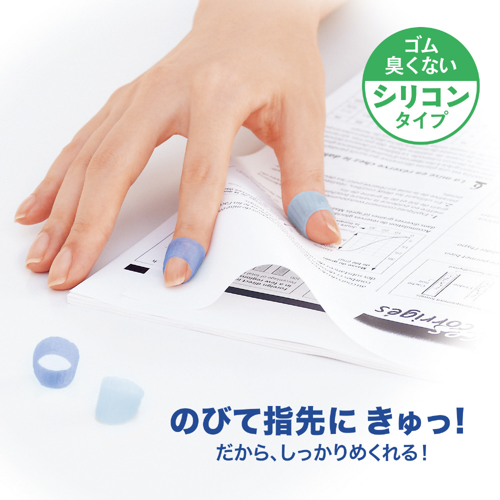 リング型(指サック)メクリッコ シリコンタイプがリニューアルして再登場!どなたでも選びやすいブルー系カラーミックス。やわらかく伸縮性に優れたシリコン素材でしっかりフィットしスムーズに紙がめくれます。リング形状なので長時間付けたままでもムレにくく、ネイルアートをしている爪の長い方でも安心して使用できます。