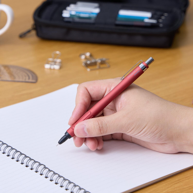 滑りにくく持ちやすい独自デザインのグリップに、手にフィットする曲線的なアルミボディのシャープペンシル