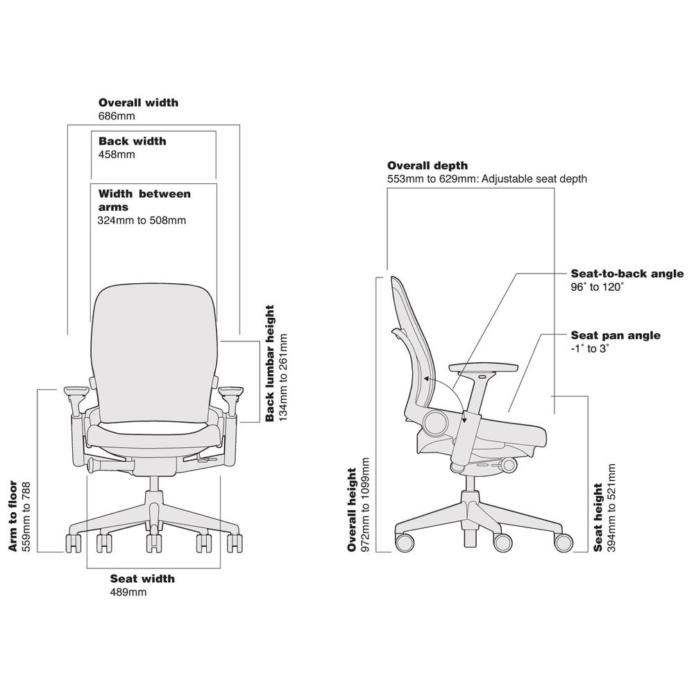 座り方やリクライニングの位置を問わず、身体の姿勢に合わせてサポートする事で快適な座り心地を提供するチェアがLeap。機能面では座面の奥行き・アームを全面的に調節、ランバーサポートを背中の下部から腰にかけてお好みの位置に高さと硬さを整える事も可能です。その他空気圧による座面高さ、リクライニングの反発力、及び5段階のリクライニングロックによる調節が可能です。