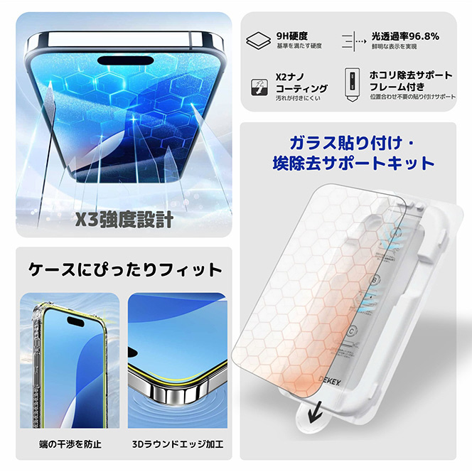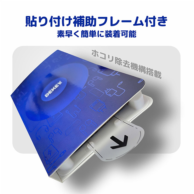 防塵ガイド枠とクリーニングキットが付属し、誰でも簡単に貼り付け可能。位置合わせがしやすく気泡も入りにくい構造で、美しい仕上がりを実現します。