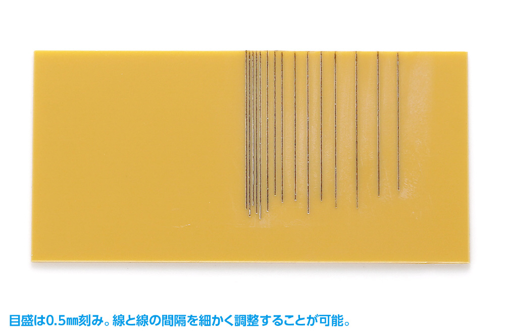 目盛はエッチング彫刻+インク流しこみで作製。見やすく、かつ消えにくい仕様です。0.5mm刻みで、より細かな作業が可能に。