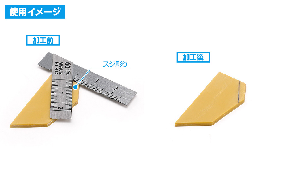 短く取り回しやすいため、パーツのフチにあてながら一定の角度でスジ彫りが行えるガイドとしても便利です。