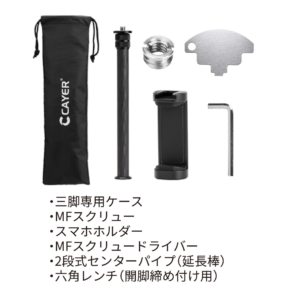 【付属品】専用ケース(延長棒ポケット付) / スマホホルダー(スマホ固定幅55mm〜78mm) / 2段式センターパイプ / MFスクリュー(1/4変換ネジ)×2個※内1個は雲台底部に装着済み / MFスクリュードライバー / 六角レンチ