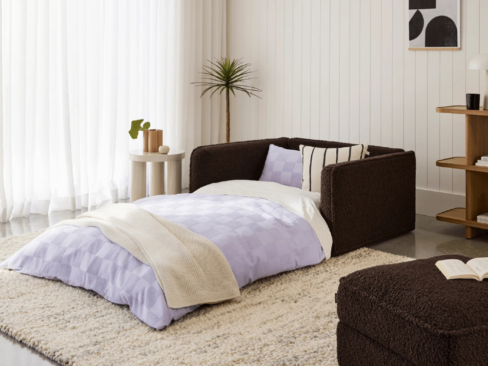 進化したCUSHYは、背もたれと座面を倒せば5秒でフルサイズのベッドに切り替え可能。