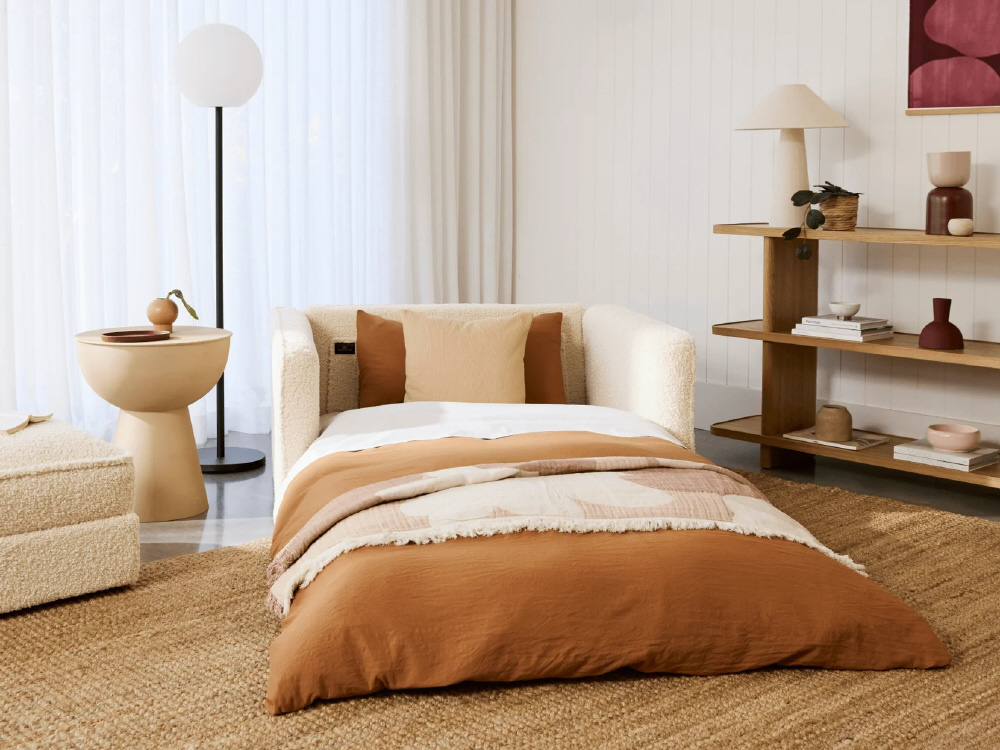 進化したCUSHYは、背もたれと座面を倒せば5秒でフルサイズのベッドに切り替え可能。