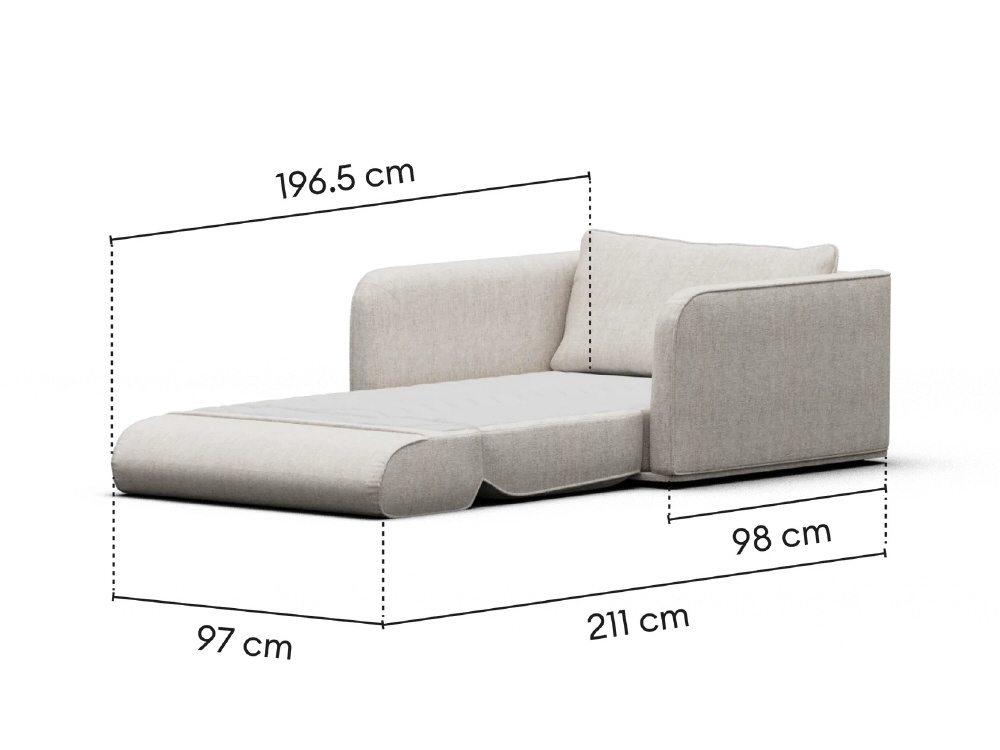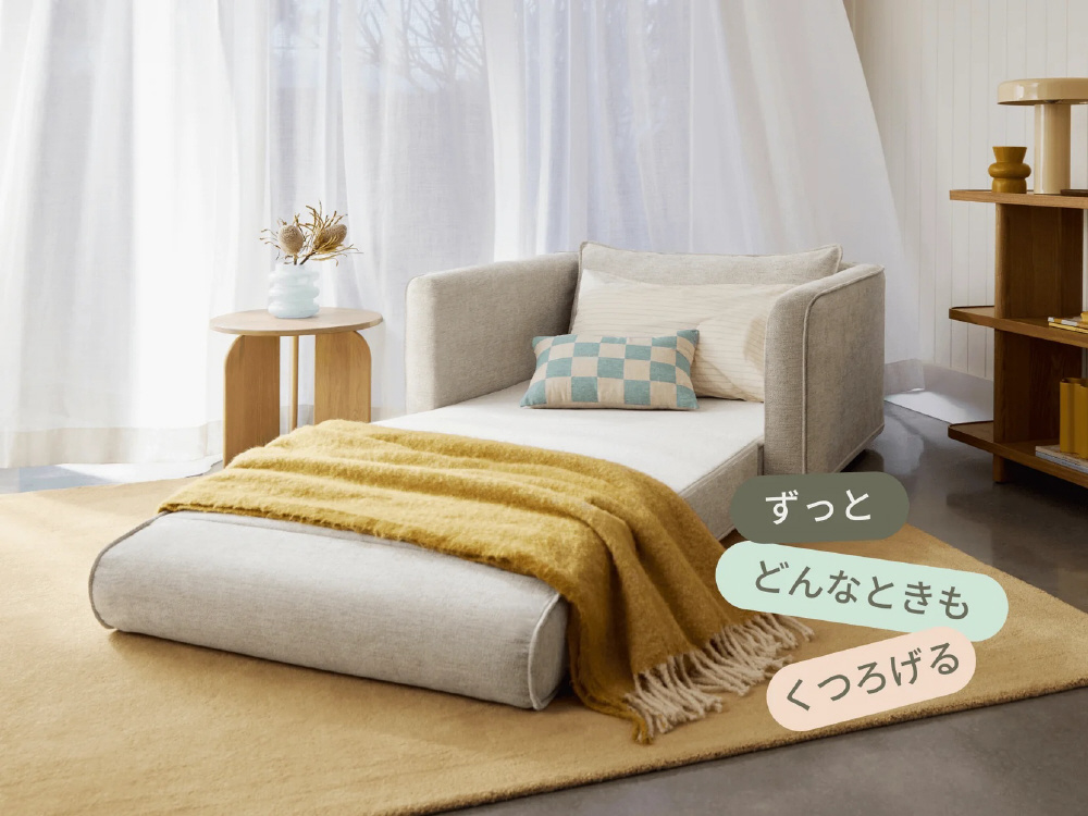 進化したCUSHYは、背もたれと座面を倒せば5秒でフルサイズのベッドに切り替え可能。