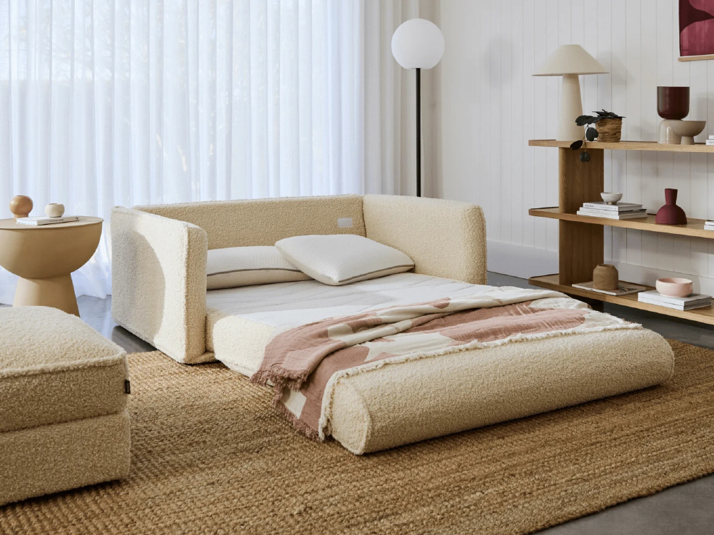 進化したCUSHYは、背もたれと座面を倒せば5秒でフルサイズのベッドに切り替え可能。