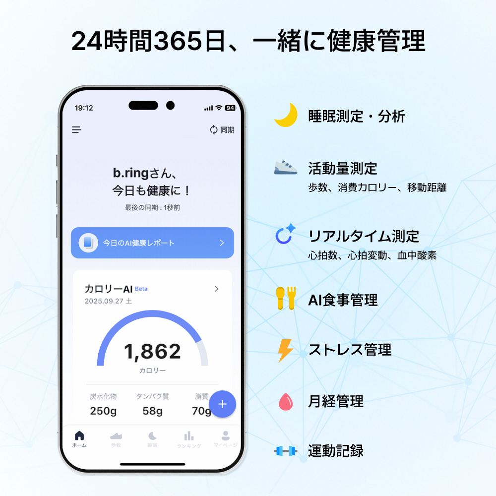 AIであなたの一日を記録し、毎日のデータを積み重ねて、あなたをサポートします。b.ringがあなたの健康的な生活習慣づくりを応援します。