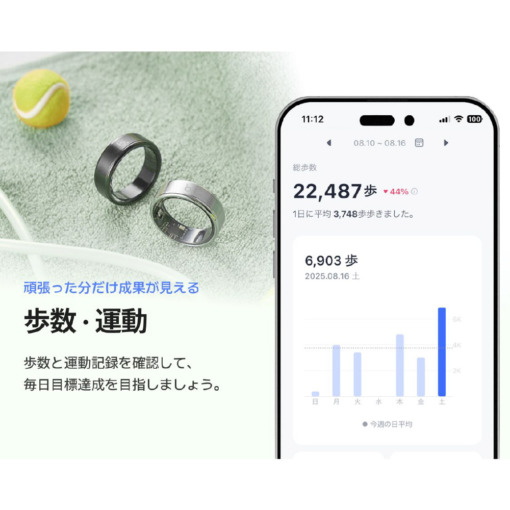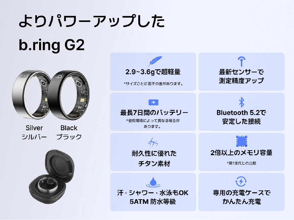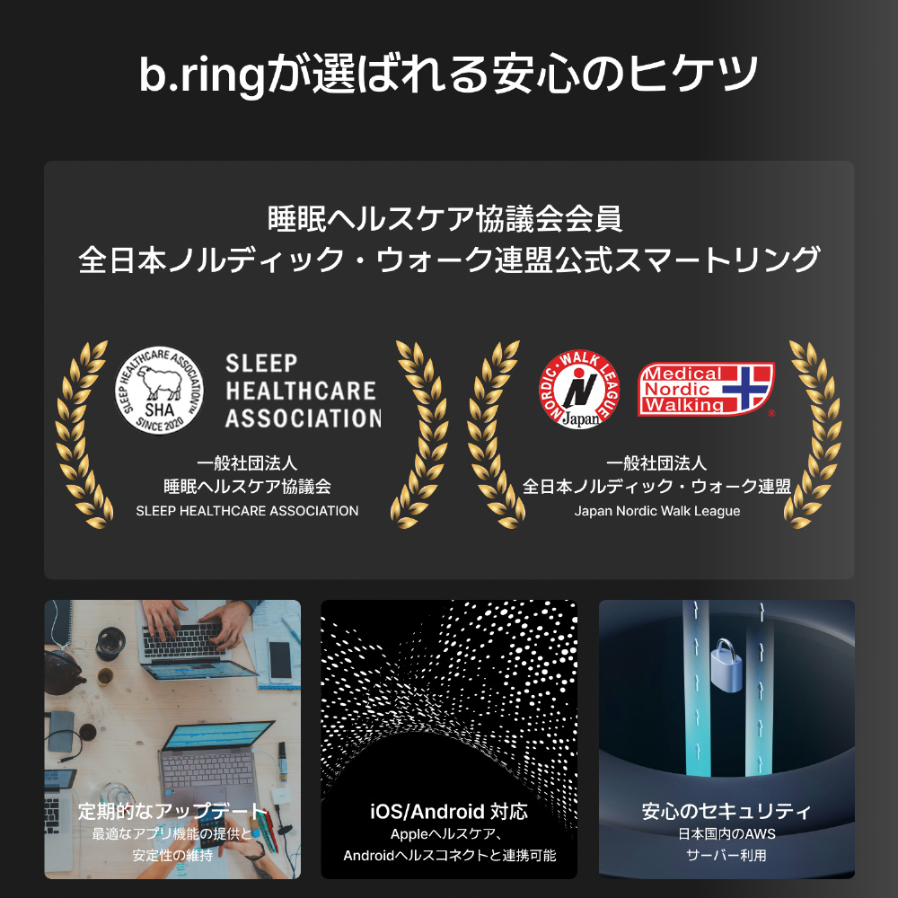 b.ringは、つけてるだけで生体情報を分析し毎日の健康をサポートするスマートリングです。日常生活に最適な着け心地とスタイリッシュなデザインが特徴です。