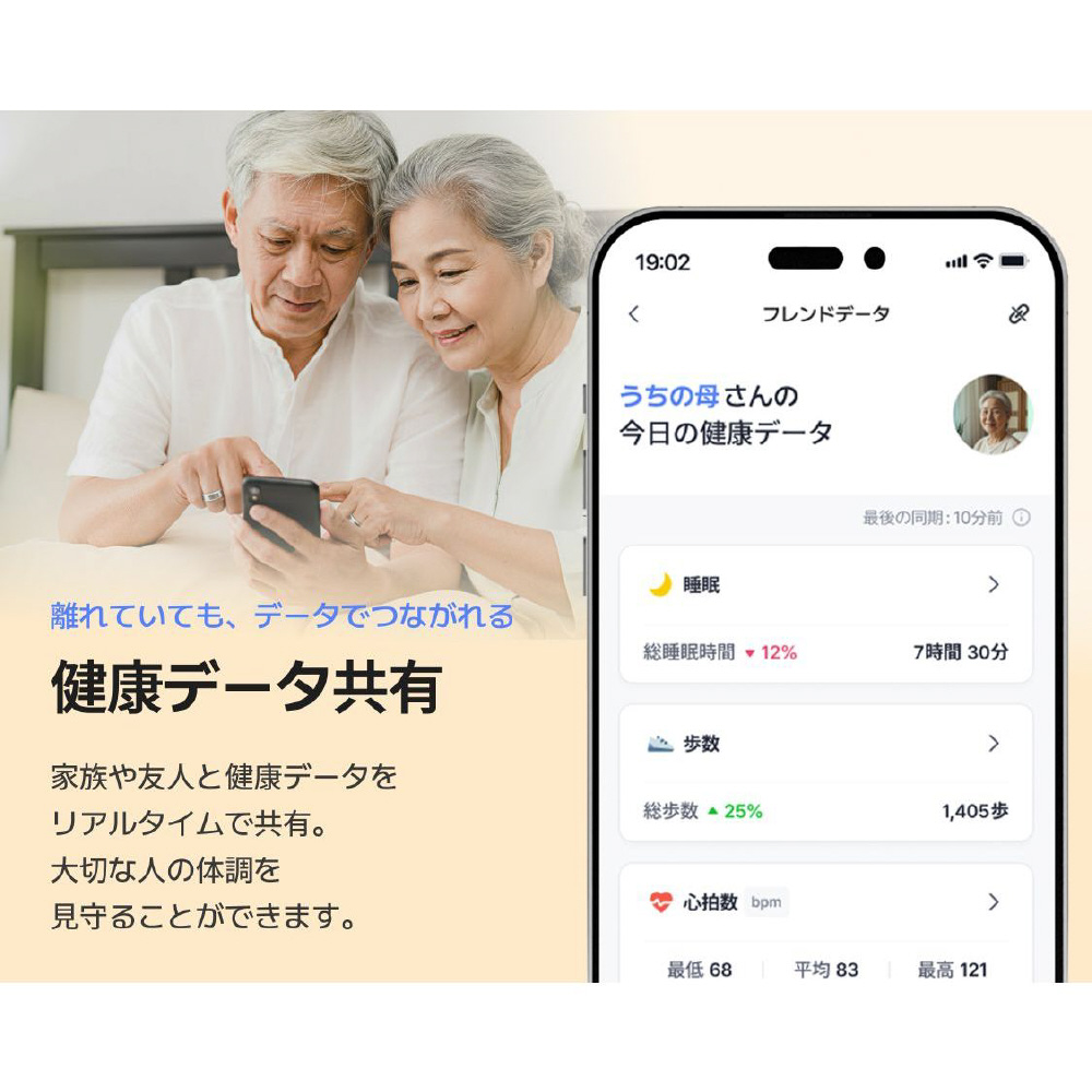 リアルタイム測定(心拍数、心拍変動、ストレス、血中酸素)、データ共有(家族や友人とリアルタイムで共有)、月経管理(生理周期予測、排卵期予測)、