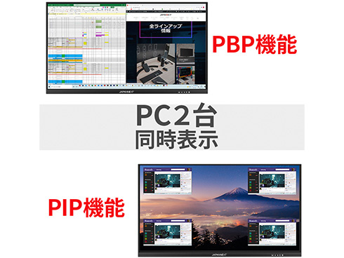 ■複数の入力を同時に表示する「PBP(Picture by Picture)」に対応、PBPモードでは、最大2つの入力映像を左右同時に表示可能。入力の一つを子画面にて表示する「PIP(Picture in Picture)」も可能です。
