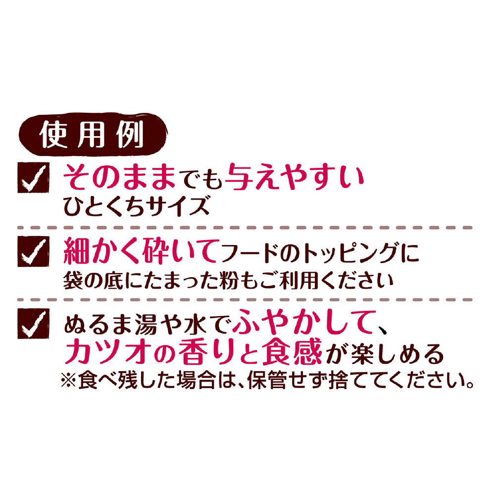 ・細かく砕いてフードのトッピングに、ふやかして素材の香りと食感を楽しめる、軽いのでおでかけやお散歩など外出時の持ち運び用おやつに・・・様々な目的に合わせてアレンジできる。