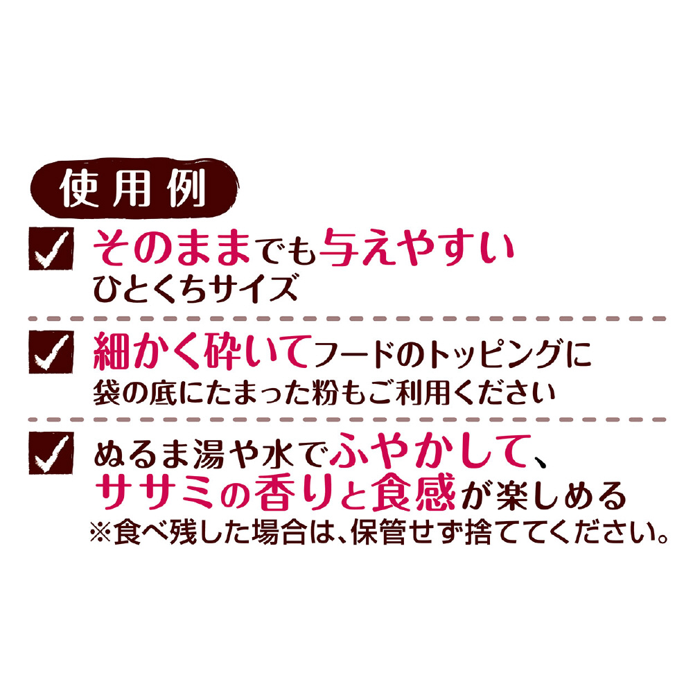 ・細かく砕いてフードのトッピングに、ふやかして素材の香りと食感を楽しめる、軽いのでおでかけやお散歩など外出時の持ち運び用おやつに・・・様々な目的に合わせてアレンジできる。