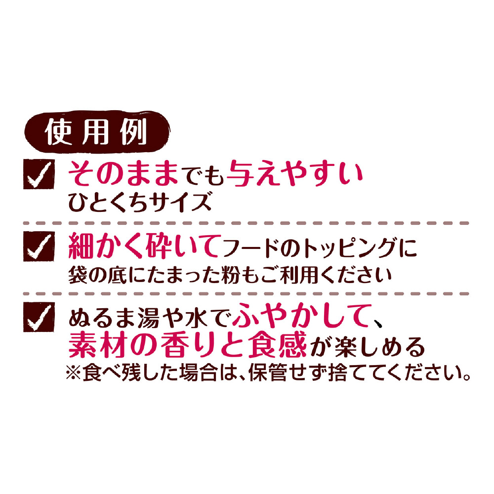 ・細かく砕いてフードのトッピングに、ふやかして素材の香りと食感を楽しめる、軽いのでおでかけやお散歩など外出時の持ち運び用おやつに・・・様々な目的に合わせてアレンジできる。