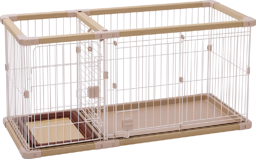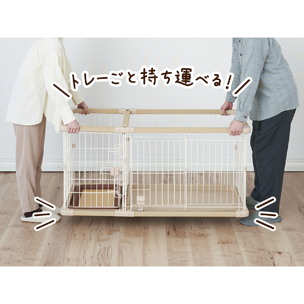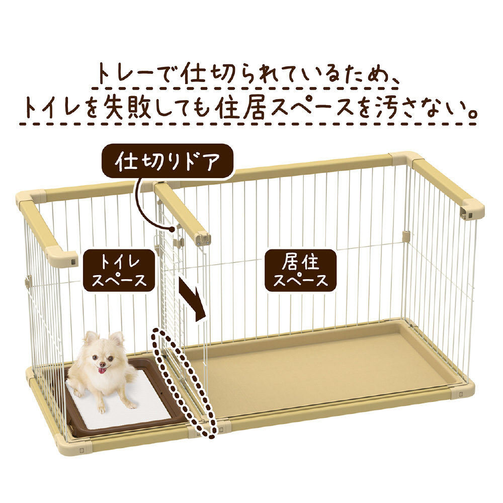 トイレと住居スペースを区切れるから、トイレの場所を覚えやすい!住居側は横スライドドアで開閉がスムーズ。トイレ側はドアが大きく開き、ワンちゃんの出入りやシーツ交換もラクラク!