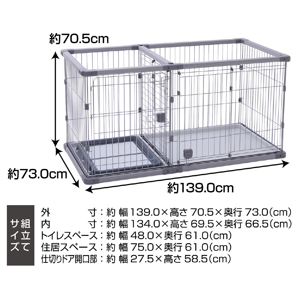 外寸/約幅139.0×高さ70.5×奥行73.0cm、内寸/約幅134.0×高さ69.5×奥行66.5cm、住居スペース/約幅75.0×奥行61.0cm、トイレスペース/約幅48.0×奥行61.0cm、仕切りドア開口部/約幅27.5×高さ58.5cm、スライドドア入口/約幅35.0×高さ57.0cm、セカンドドア入口/約幅47.0×高さ63.5cm