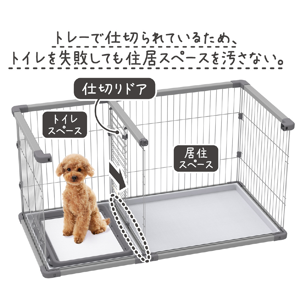 トイレと住居スペースを区切れるから、トイレの場所を覚えやすい!住居側は横スライドドアで開閉がスムーズ。トイレ側はドアが大きく開き、ワンちゃんの出入りやシーツ交換もラクラク!