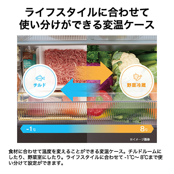 食材に合わせて温度を変えることができる変温ケース。チルドルームにしたり、野菜室にしたり。ライフスタイルに合わせて-1℃〜8℃まで使い分けて設定ができます。