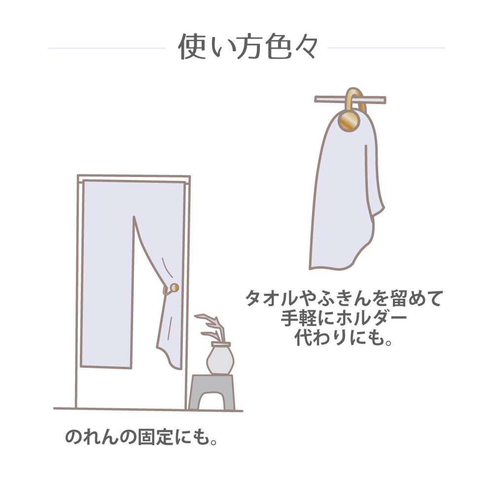 単にカーテンをまとめる時だけでなく、少し開けたいとき等にも使用可能。さらには洗面台のタオルのホルダーとしてもご使用いただけます。