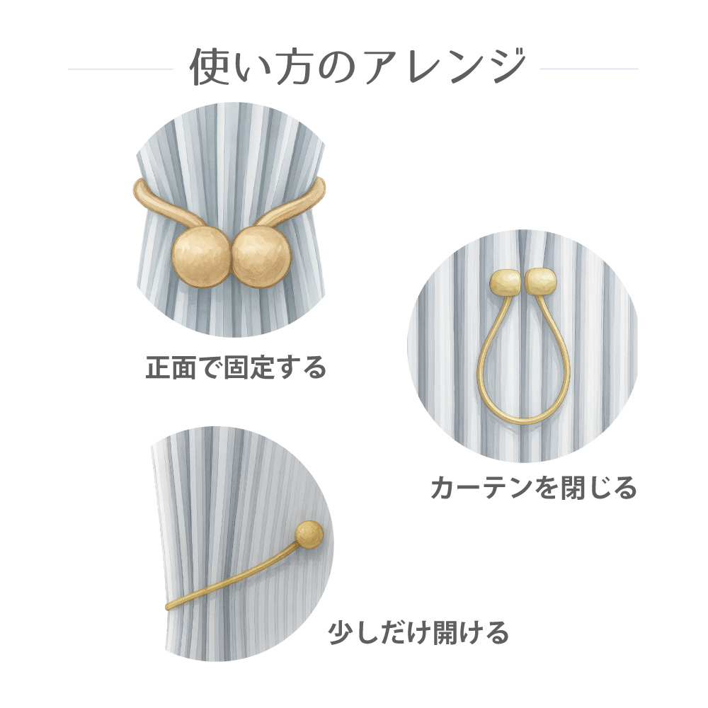単にカーテンをまとめる時だけでなく、少し開けたいとき等にも使用可能。さらには洗面台のタオルのホルダーとしてもご使用いただけます。