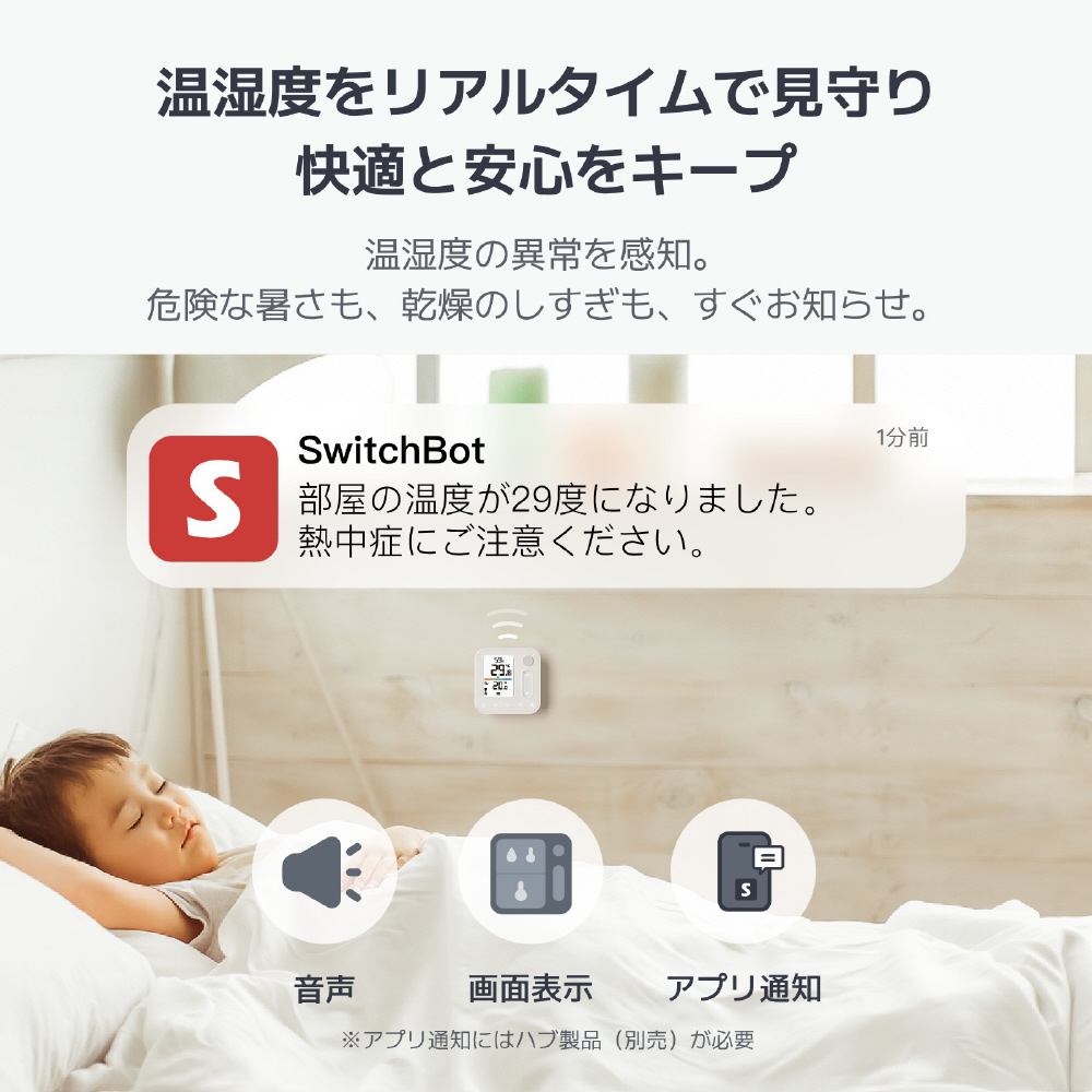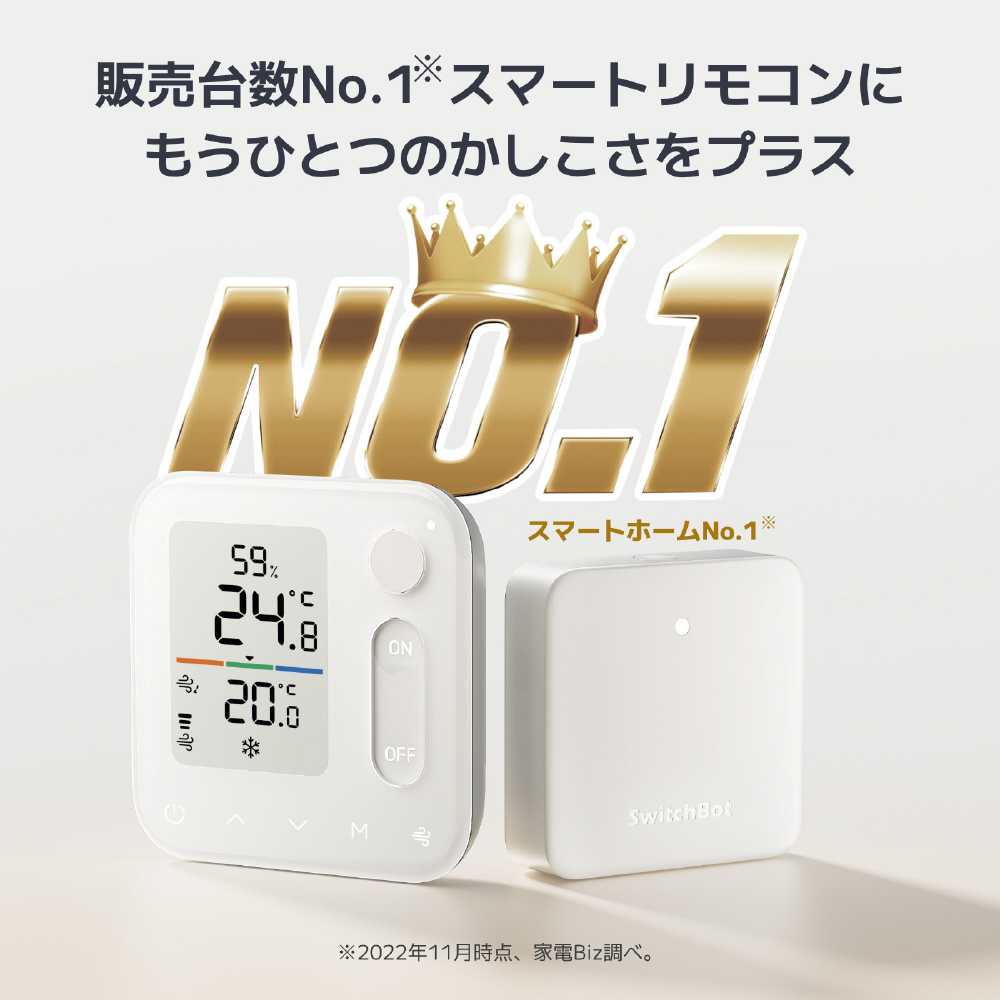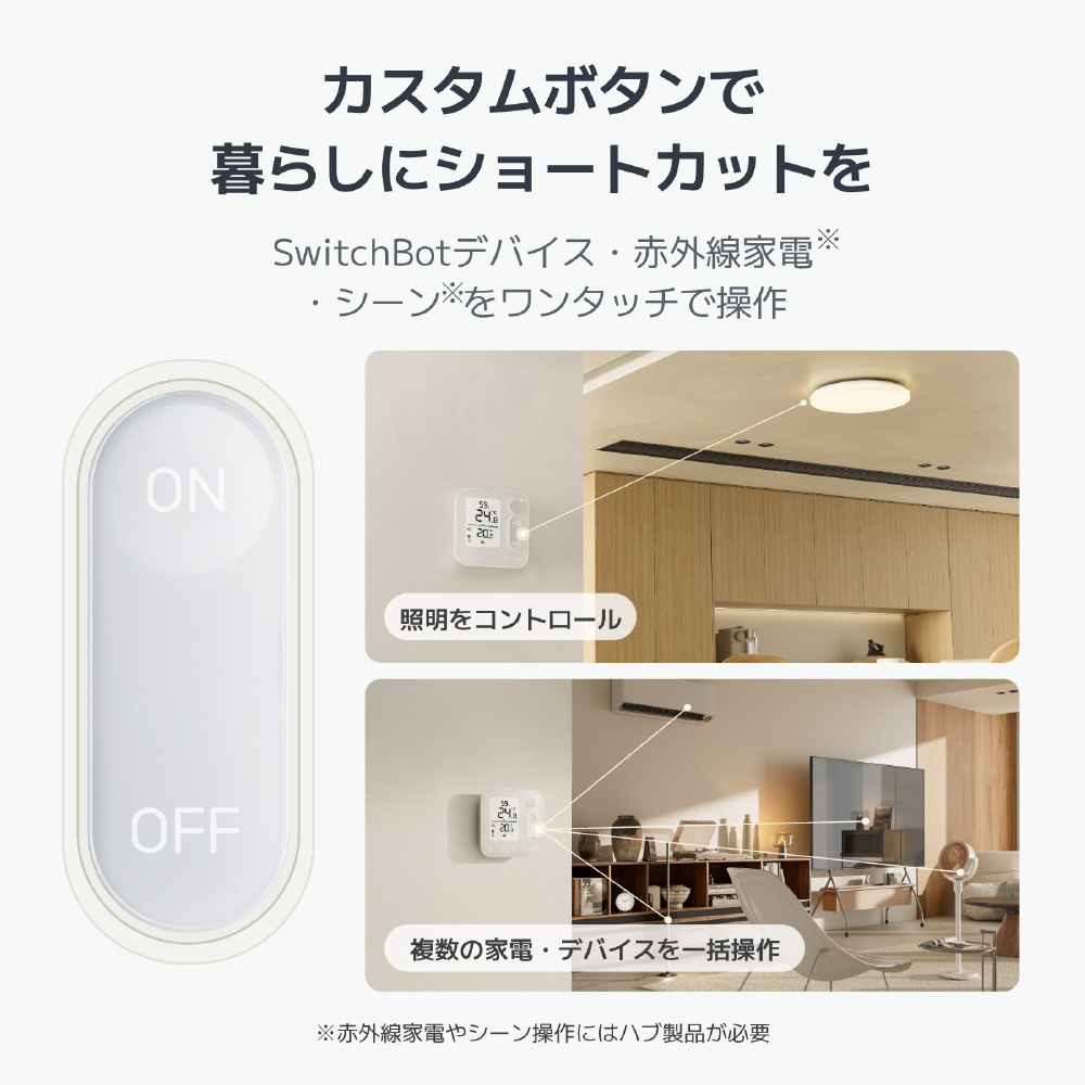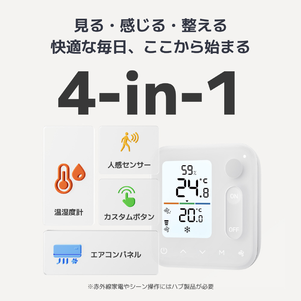 ・温湿度計・人感センサー・リモートボタン・エアコンリモコンを1台に集約 ・室温と設定温度を同時に確認、温湿度によって自動シーンも設定可能、「快適」に確かな裏づけを ・人感センサー機能で節電、人の長時間の不在を感知すると自動でエアコンをオフ ・2つのカスタムボタンで、赤外線家電やSwitchBotデバイスをスマホさえなしで操作可能