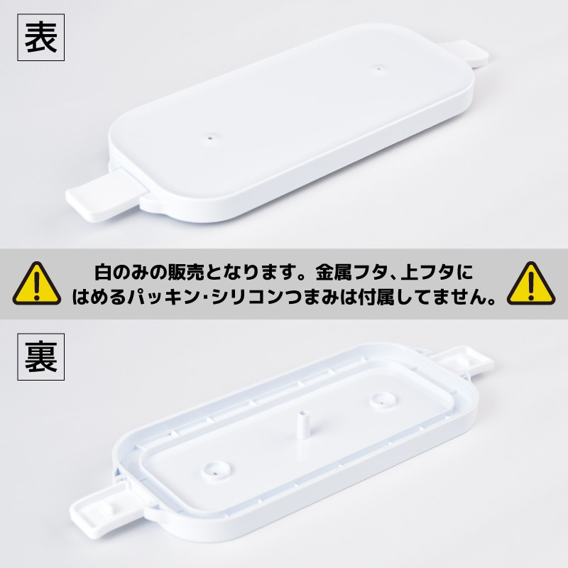 仕様2 白のみの販売となります。 金属フタ、上フタにはめるパッキン・シリコンつまみは付属していません。