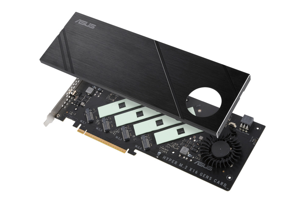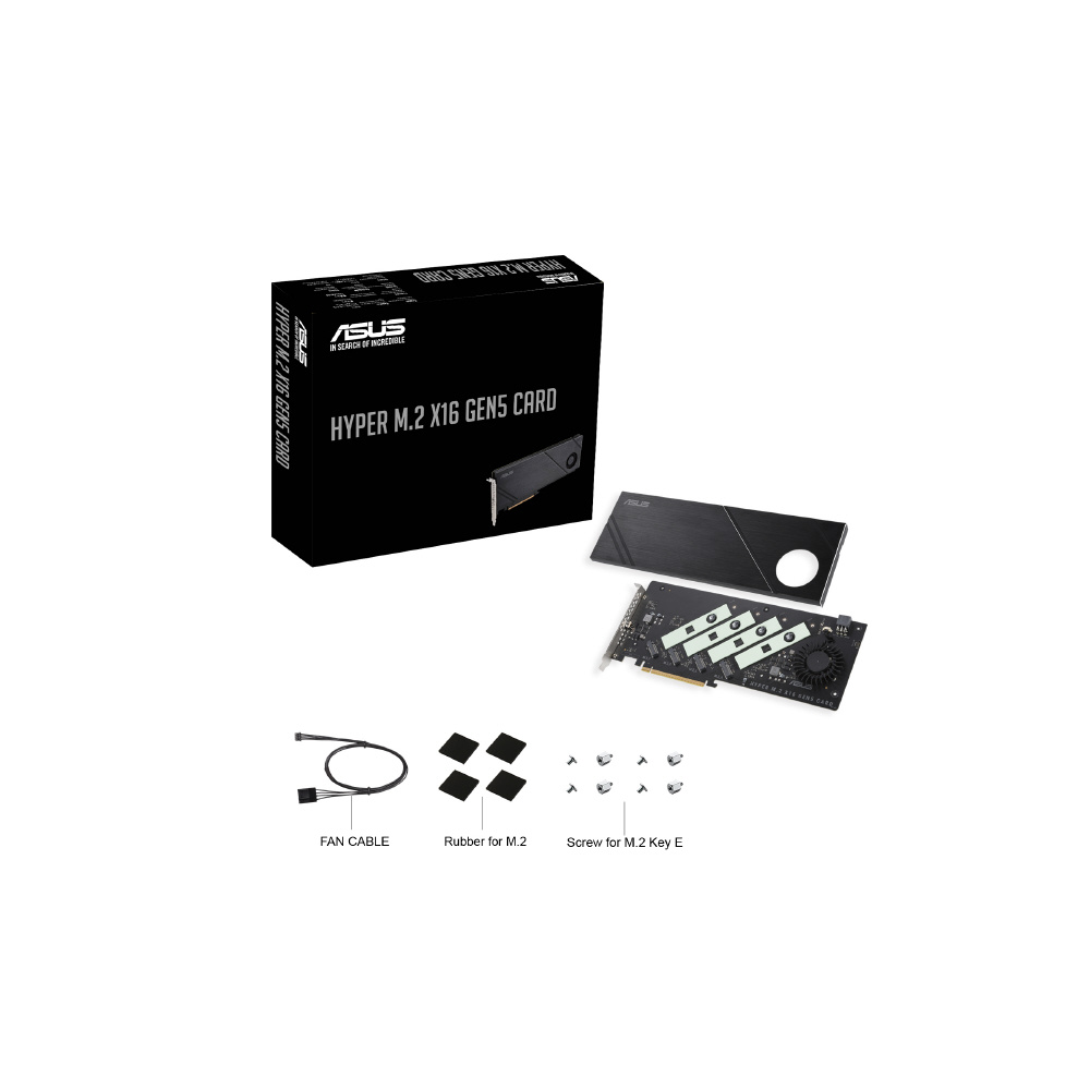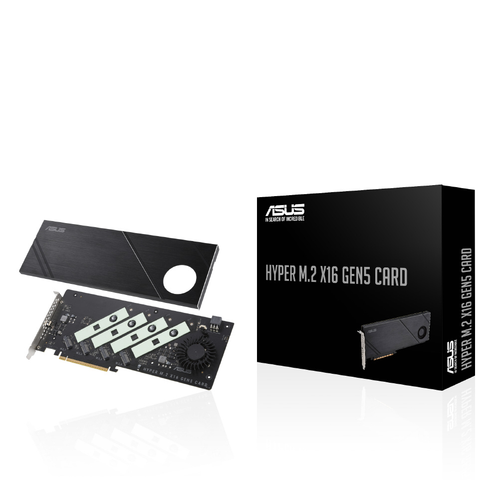 ASUS Hyper M.2 x16 Gen5 カード (PCIe 5.0/4.0) は、最大 4 つの NVMe M.2 (2242/2260/2280/22110) デバイスを最大 512 Gbps でサポートし、さまざまな CPU プラットフォームで RAID 機能を実現します。