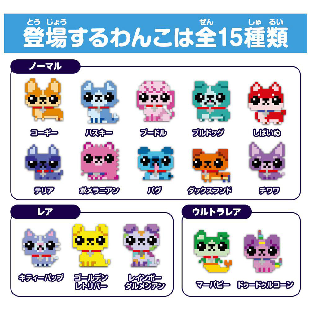 ■キャラクターはノーマル・レア・ウルトラレアの全15種類!お気に入りのわんこを見つけよう。