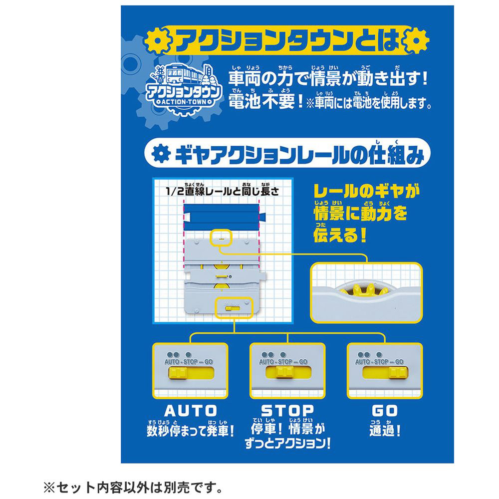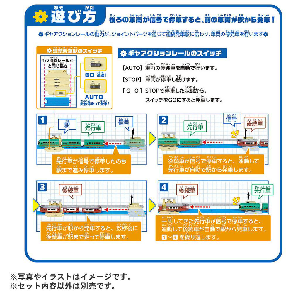 ギヤアクションレールはスイッチでAUTO、STOP、GOの3種類に切り替えができます。(2編成で遊ぶ時にはスイッチをAUTOにして遊んでください)