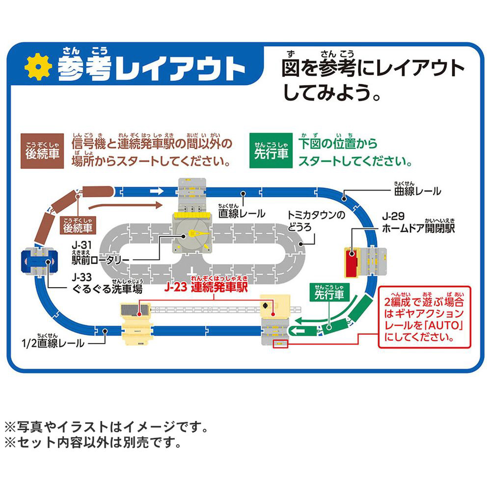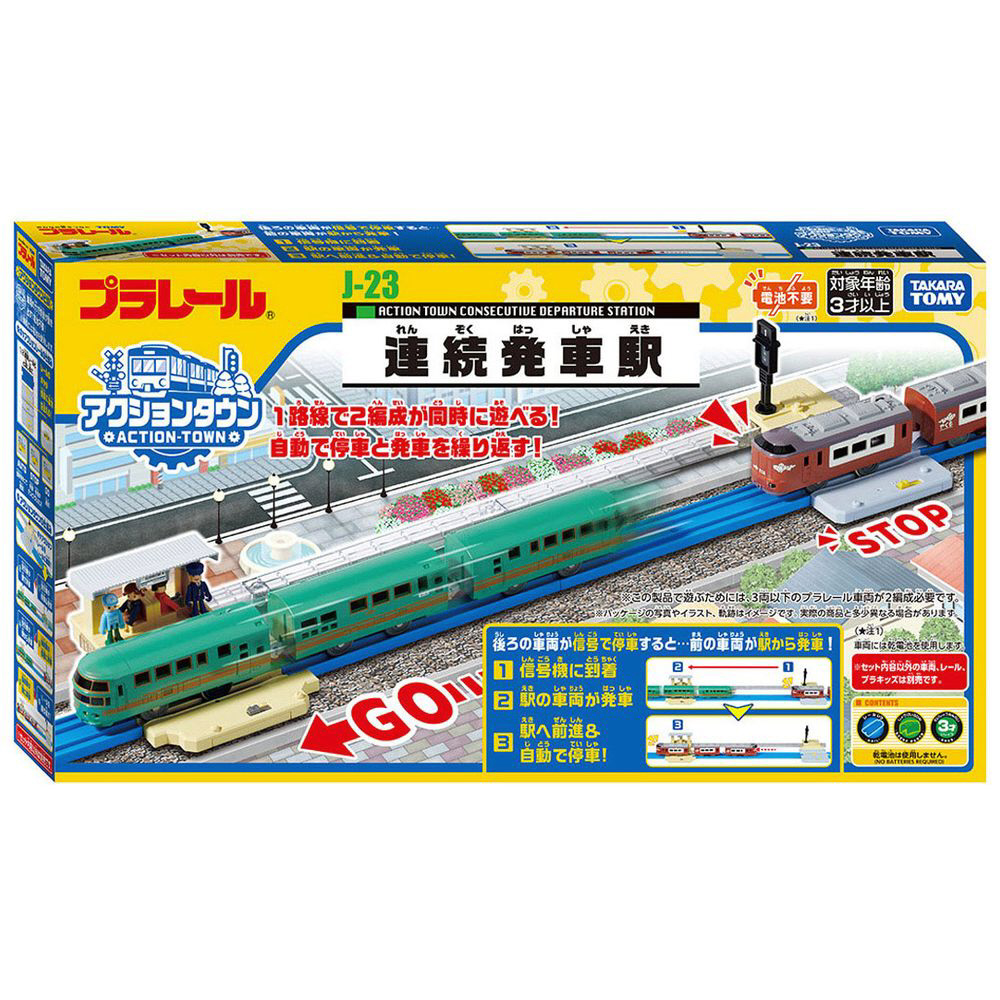 ※連続発車駅を機能させるために2編成のプラレール車両が必要になります。(車両は各3両以下で遊んでください)