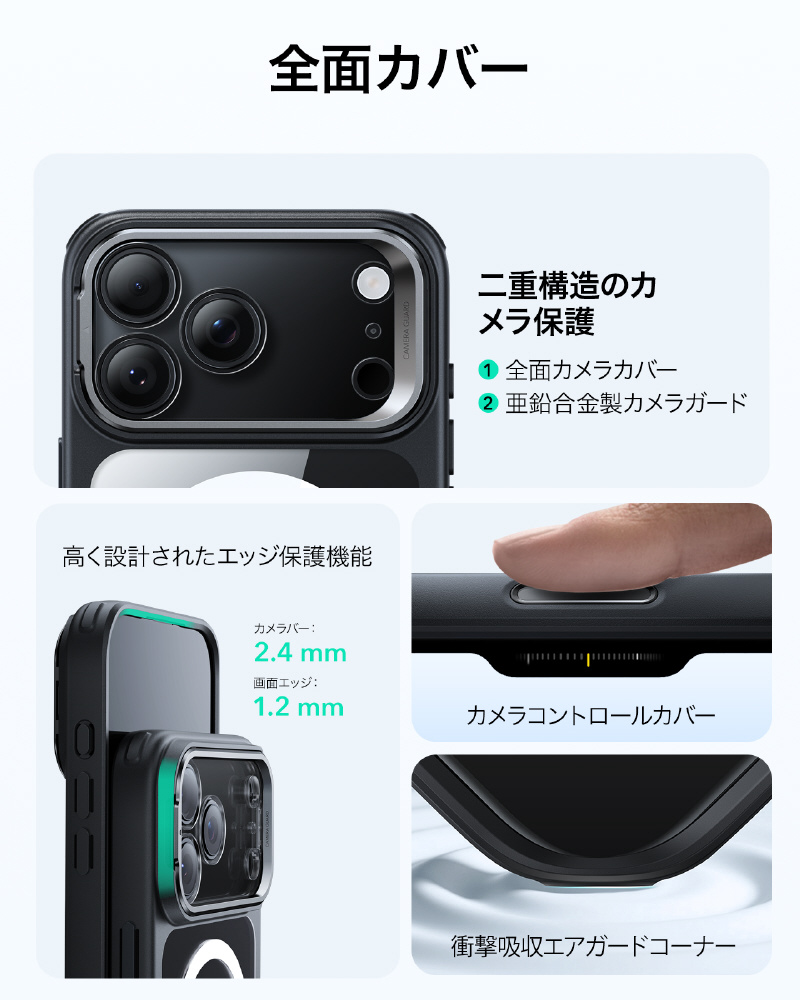 カメラレンズはスマホの命です!このiPhone17ケースはレンズ全体を覆うフルカバーと、丈夫な亜鉛合金製スタンドの二段構えで傷から徹底保護します。さらに周辺部よりわずかに高く設計されているため、置くときや落とした時の擦り傷やキズからもレンズを守ります。機能性と美しい一体感を実現したデザインです