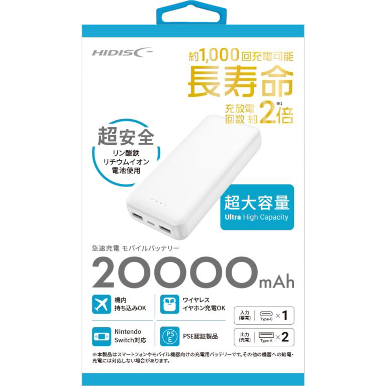 リン酸鉄モバイルバッテリー 20000mAh ホワイト HD-MB20000RSLSWH [3ポート]