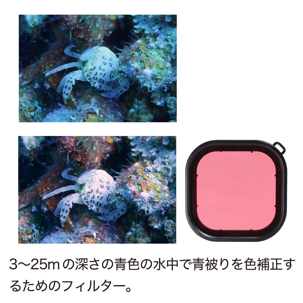 GoPro純正ダイブハウジングに対応。簡単装着で使える、水中撮影用レッド系カラーフィルター。