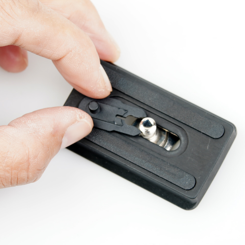 アルカ互換の雲台に対応するクイックシュー。ビデオピン付き。