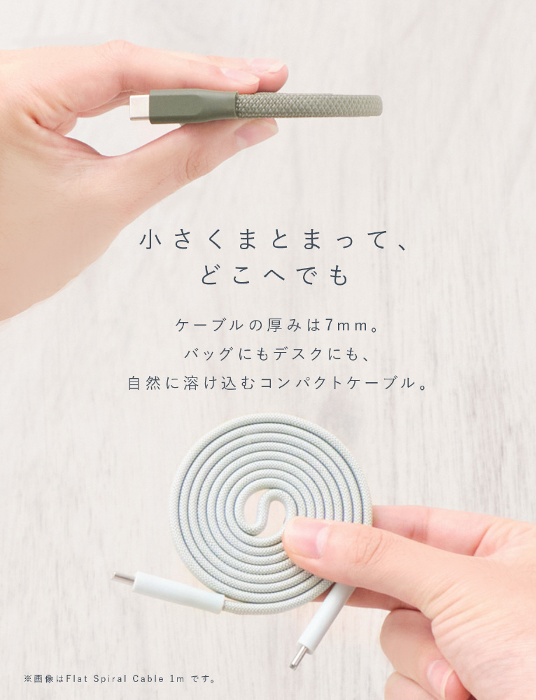 薄いフラットケーブルに磁石を内蔵。厚みを抑えた渦巻き状にきれいにまとまるため、非常にコンパクトにまとまります。体積をとらないのでカバンやポーチの隙間にスッキリ収まります。ナイロンの編み込み素材は柔軟で丈夫です。