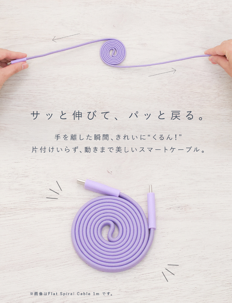 ケーブル部分に磁石を内蔵。ケーブル同士がくっついて、渦巻き状にきれいにまとまります。端子部分を持って、軽く引けばサッと展開し、手を離せば、渦巻き状に戻ります。ケーブルバンドなしにきれいにまとまる。コードリールのように使える便利なケーブルです。
