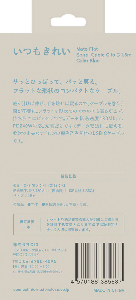 USB-C ⇔ USB-Cケーブル [充電 /転送 /1.5m /PD240W /USB2.0] カームブルー CIO-NLSC-FL-CC15-CBL [USB-C ⇔ USB-C]