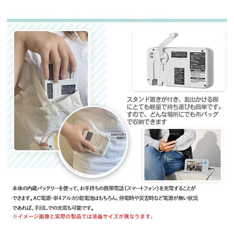 安心の日本サポート。ACアダプター、アルカリ乾電池、手回し充電、ソーラーパネル充電の4電源で使えるので、内蔵バッテリーに充電した電池を出力してスマートフォンの充電も可能。普段使いはもちろん、緊急時や災害時でも使えます。軽量&コンパクト 緊急時でも持ち運びやすいコンパクト設計。防災リュックに入れてもかさばりません。大きく見やすい 液晶サイズは4.3インチ。