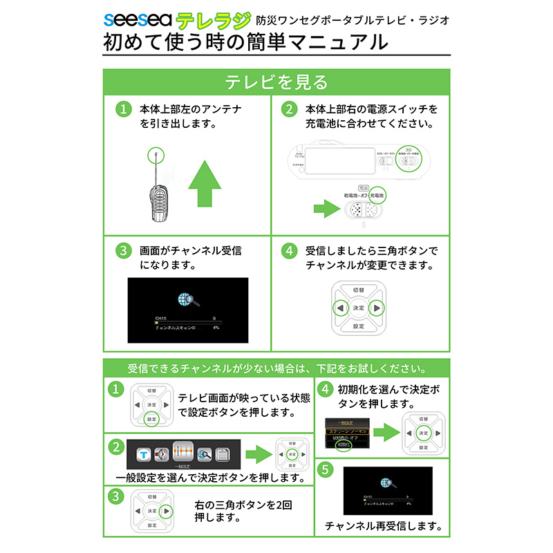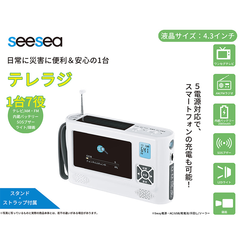 1台7役の優れもの!ワンセグテレビ、FMラジオ(ワイドFM対応)、AMラジオ、LEDライト、SOSサイレン、携帯充電、録画機能を搭載!緊急時や災害時でも安心 SeeSeaJapan