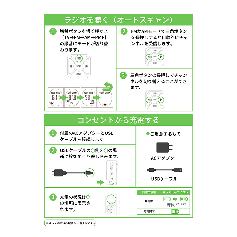■ワンセグテレビにはメニューモードを搭載し、番組表などの閲覧も可能です。■サブテレビとしても大活躍 テレビのないキッチンや寝室、さらには外出先でもご使用いただけます。防災に特化された商品でも、いざとなった時に使い方が分からず、災害時などに取扱説明書を読むことは現実的ではありません。いつも使っている慣れ親しんだ商品なら、いざという時も安心です。■防災アドバイザーも推奨 防災袋などを用意していて入れておいても定期的にチェックをしなければ、いざという時に「使い方が分からない」「故障して使えない」など本末転倒になってしまうことも。普段から使うことで操作にも慣れており、故障していないかも常に把握できます。いざという時にサッと手に取れるサイズながら、分かりやすいボタンや大きく見やすい液晶画面、さらにはLEDライトにスマートフォン充電、SOSサイレンなどを装備しており、防災アドバイザーとしての観点から見ても非常に考えられた商品です。■仕様 寸法:約16.0×3.9×10.0cm 重量:約361g(AC含まず) 解像度:480×272ピクセル 受信周波数範囲:テレビ470〜770MHz、FM76.0〜108.0MHz(ワイド対応)、AM522〜1710kHz スピーカー最大出力:1.25W(8Ω) 電源:リチウム電池(3.7V-2000Mah)、単3形アルカリ乾電池×3本、USB給電(DC5V/1A)、ソーラーパネル充電、手回し充電 コネクタ:イヤホン出力端子×2、USB Type A出力端子×1(出力用)、USB Type C入力端子×1(給電用)、タイ、ロッドアンテナ(TV, FM用)×1、タイロッドアンテナ(TV, FM用)×1 付属品:充電アダプタ×1、USBケーブル×1、MicroSDカード(16GB)×1、日本語取扱説明書、簡単マニュアル 保証期間:1年