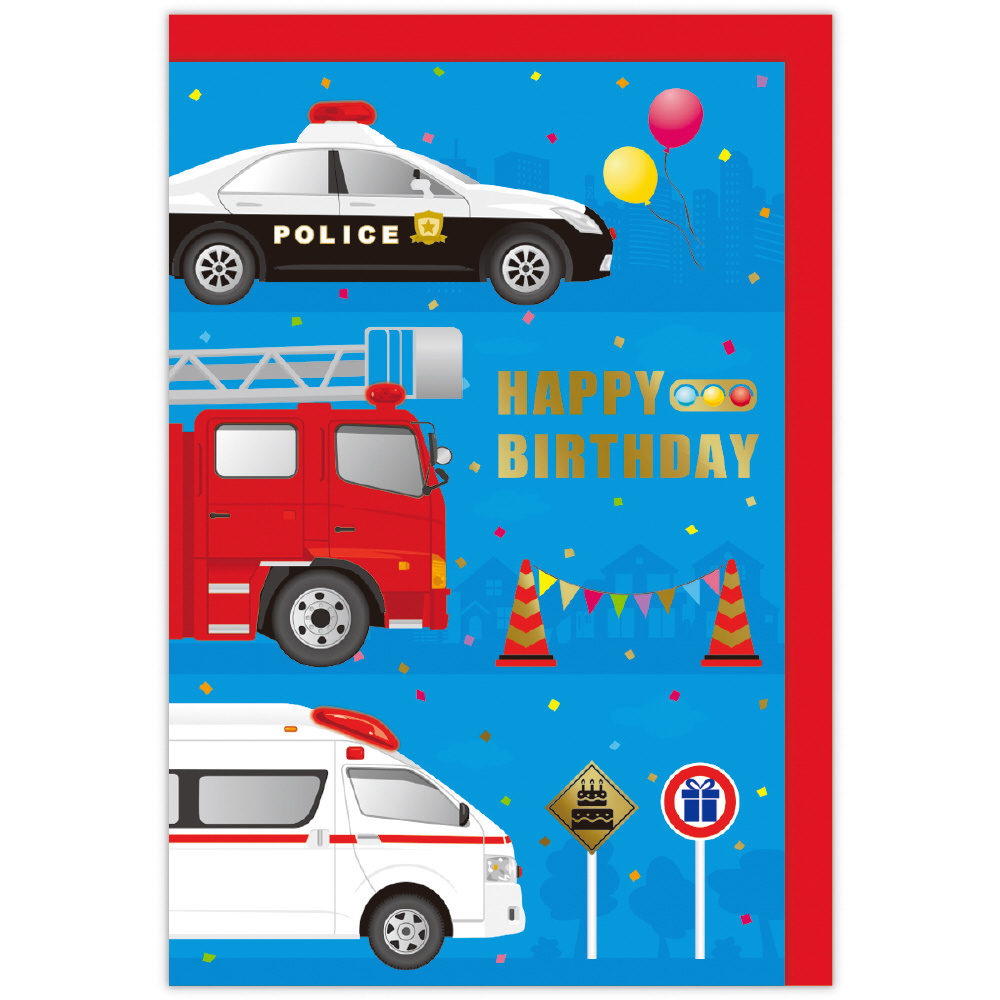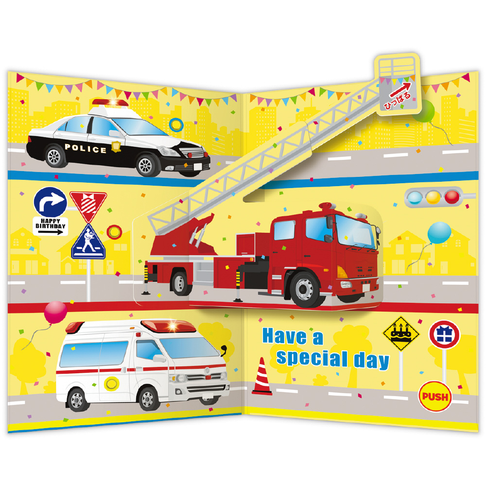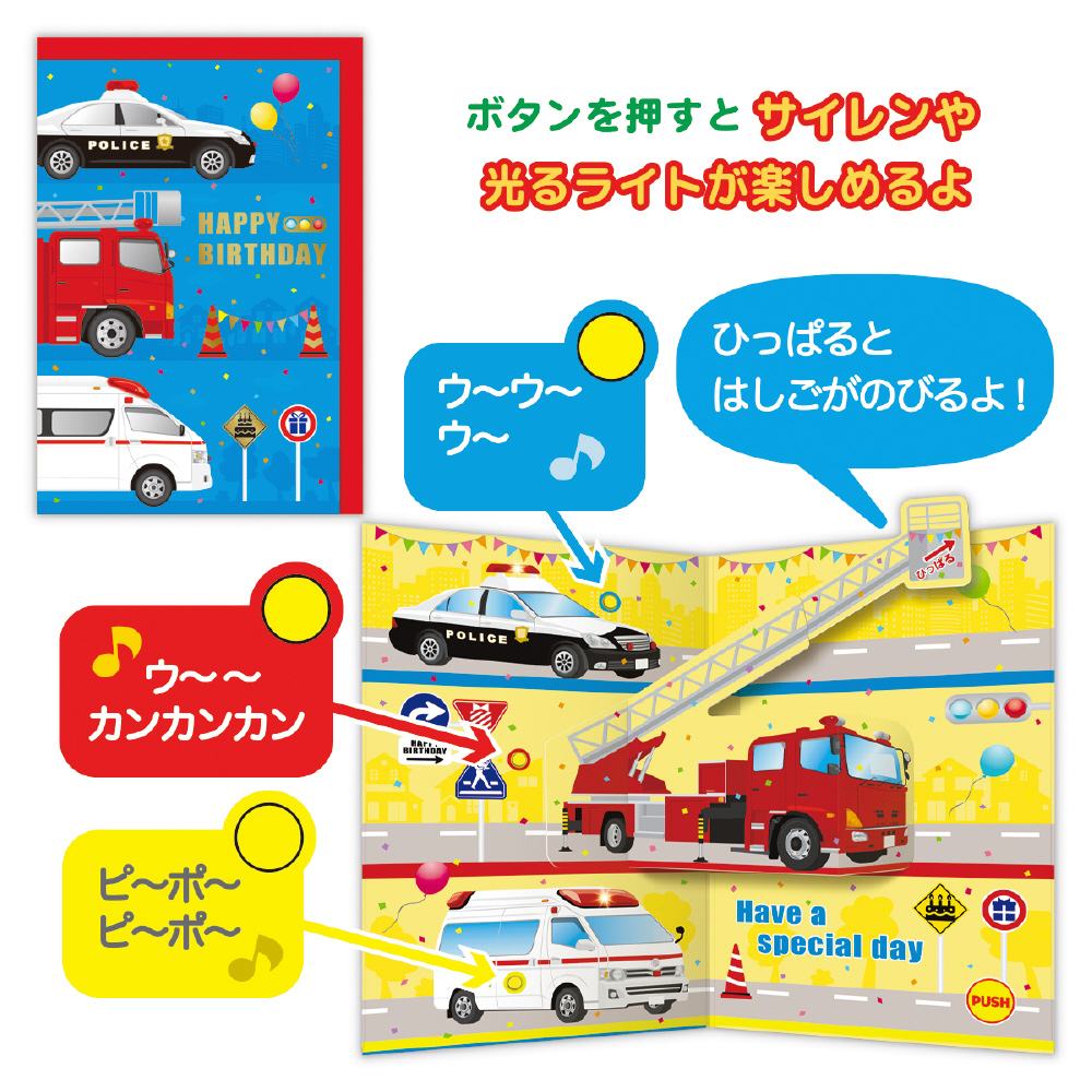 お子さまに人気のパトカー・救急車・消防車をモチーフにしたオルゴールカード。リアルなイラストとサイレン音、光るライトなど細部までこだわりが詰まっています。消防車のはしごは引っ張ると伸びる仕掛け付き。