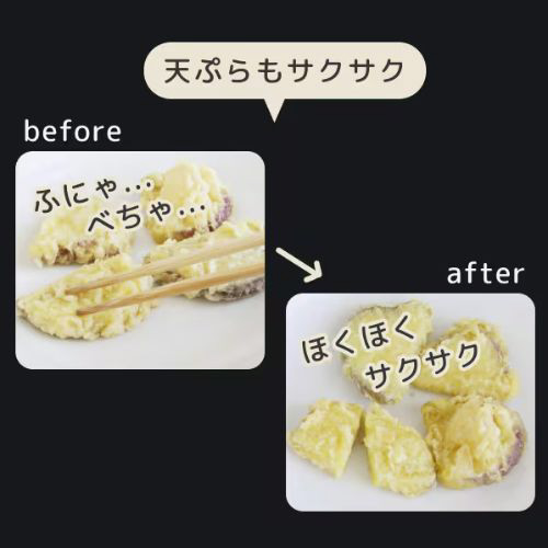 油を使わなくてもカリッと仕上がる秘密は、熱風を食材に当てて調理することができるから。余分な油は下に落とすのでヘルシーに。外はカリッと仕上がります。ベチャベチャになったお惣菜もサクサクになります。